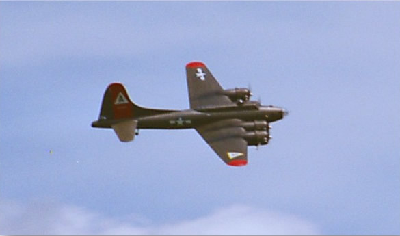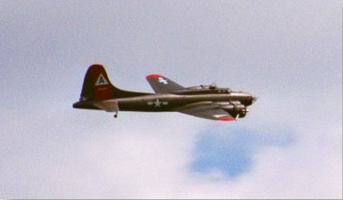 Randy Linderman says: "My B-17 G, The Miss Rebecca D. All wood 1/10th scale, 44 pounds, built from Bob Holman plans. OS.61sf"s turning Graupner 11x7 3 blade props. Plenty of power and flies great. It has been rebuilt twice since construction started in '91. Once due to electronic malfunction, once due to pilot malfunction. : ) That is me in 1/10th scale back by tail."