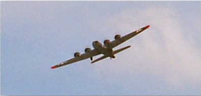 Randy Linderman says: "My B-17 G, The Miss Rebecca D. All wood 1/10th scale, 44 pounds, built from Bob Holman plans. OS.61sf"s turning Graupner 11x7 3 blade props. Plenty of power and flies great. It has been rebuilt twice since construction started in '91. Once due to electronic malfunction, once due to pilot malfunction. : ) That is me in 1/10th scale back by tail." |