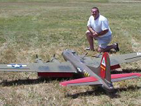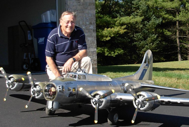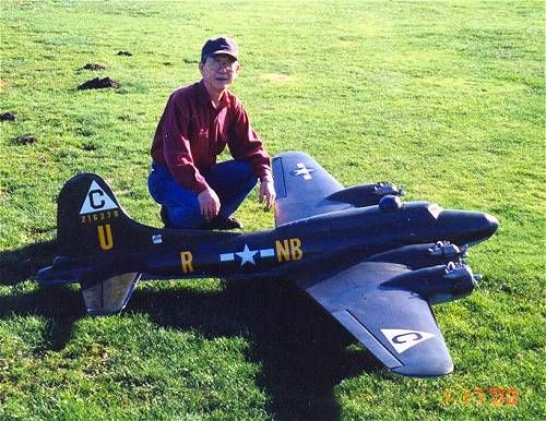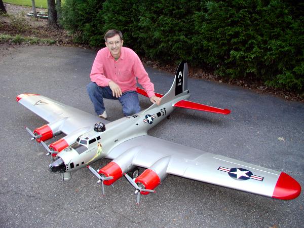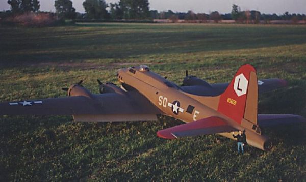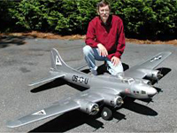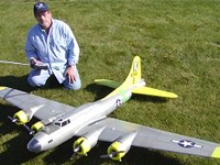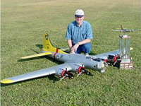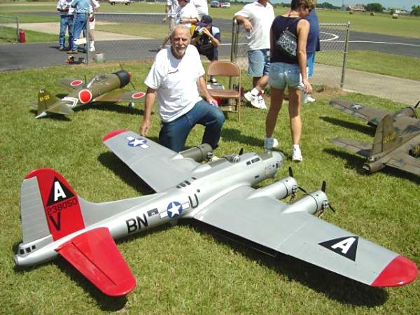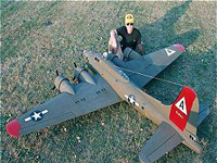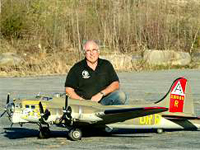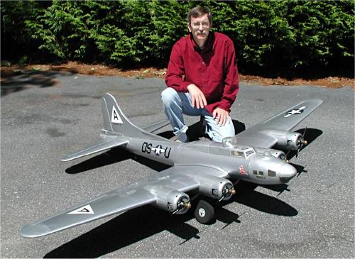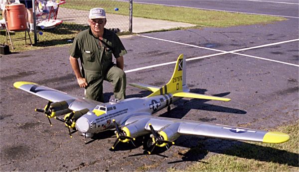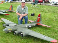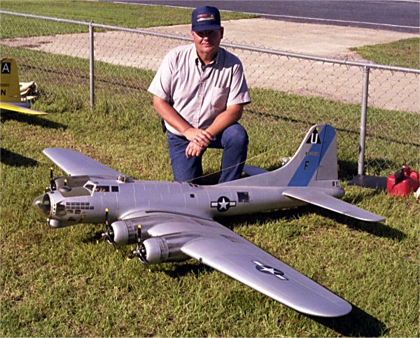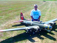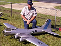 Larry Wells from Sturgeon, Mo. poses by his magnificent American Eagle kit B-17. This bird has a 123" wingspan and uses four OS .70 engines to haul it's 48lbs around the sky.