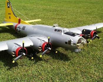 Paul Grubich's B-17 was built by master craftsman Roger Layton from scratch and uses wood construction with glassed surfaces. Coming at 70lbs this big boy has a 13 ft. wingspan. Four Saito 1.50's keep it moving while scale Robart retracts keep it rolling. I have several flights on it now and it fly's great!