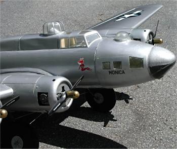 David Seales from North Carolina with his American Eagle B-17. Wingspan is 10 feet and 4 inches. Weight is 44 pounds. Powered by four Saito 72 4-stroke engines, each with its own 12-ounce fuel tank. Likes Line retract system, JR radio, flaps. Fiberglass over balsa sheeting over foam wing construction, and all fiberglass fuselage. Noseart decals are custom from CFC Decals in Rhode Island. |