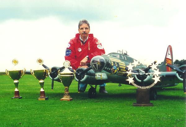 Jan Hermkens (the flying Dutchman) from the Netherlands with his B-17. Scratch build from own plan, scale 1:8. (2500 hours) Span: 158". Weight: only 44 Lbs. Engines: only 4x Laser 0.70 four stroke, with 13x6 M.A. props at 9000 RPM. Retracts: electric and own construction. With this model 4x European Star Cup Scale Champion.