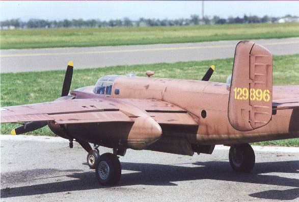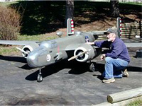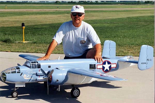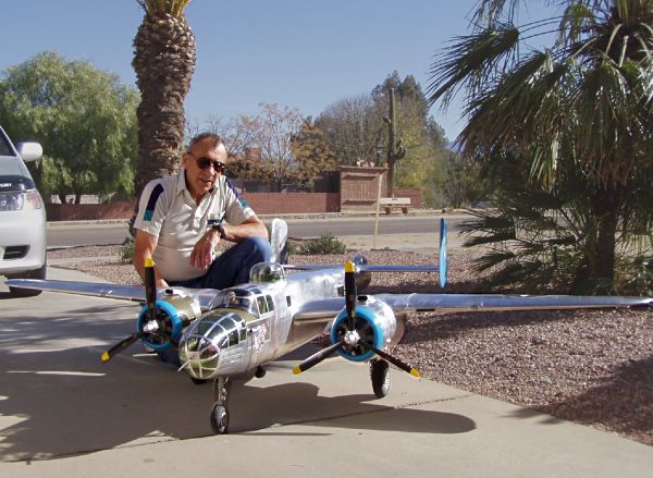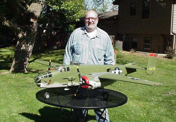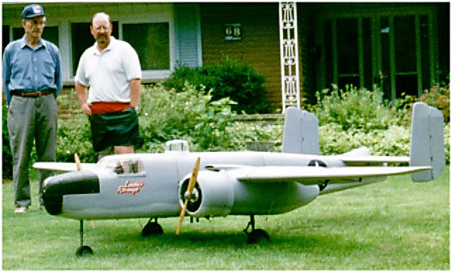 Dean Monticelli displays his B-25 built from Ziroli plans (101"). It is covered with flite metal and uses a pair of RCV 1.20s for power. It weighed 30 lbs before installing receiver and battery.