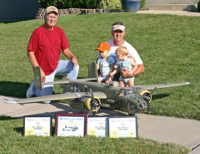Bob & Lyle Vasser of Salisbury, Missouri are a father and son team that have been in the hobby since the 70's. Bob is the builder while son Lyle is the painter and flyer in the family. Here the whole family poses with a Ziroli B-25J with two Zenoah G26's for power, it is covered in glass and painted in latex. Lyle uses Futaba for control of this 33lb model. This model won 1st place in Team Scale at the Mid States Scale Masters qualifier in Hillsdale KS, this summer 08. With this aircraft and my Expert Class P-51 entry they also won the 2008 Sunflower State Scale Champion award.
