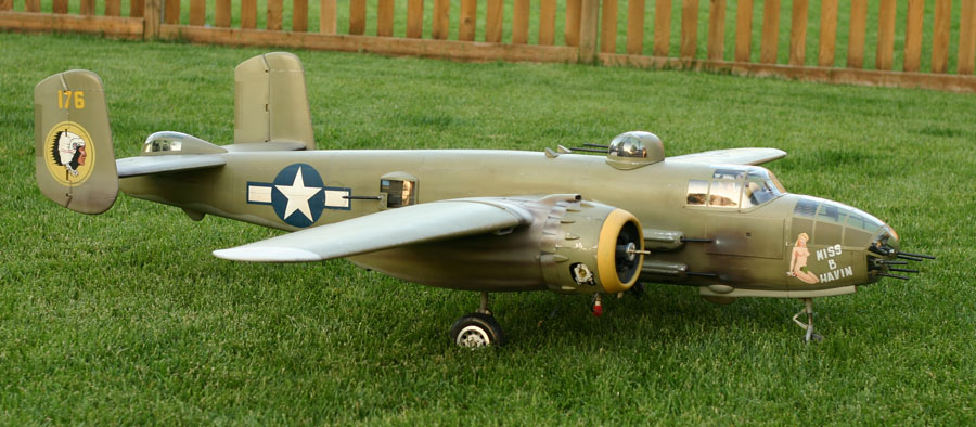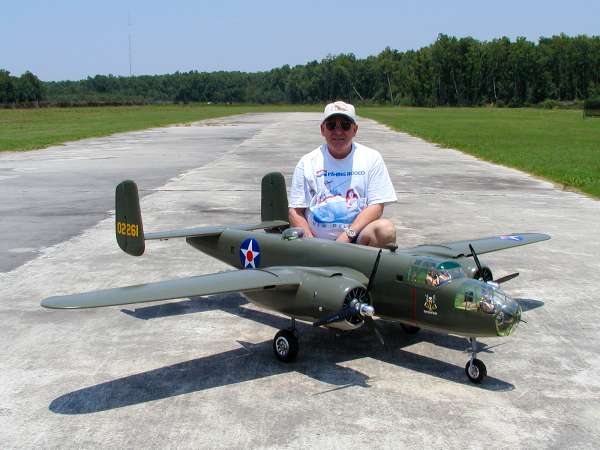Merlyn Graves from Cold Stream Ill. with his magnificent enlarged Ziroli B-25. Constructed from balsa and ply than fiberglassed this twin comes in at 44lbs with a 126" wingspan. Two G-45's fly it very scale.