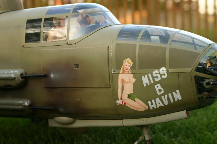 Gene Hallaway from Claremont, Minn. poses behind his beautiful B-25 b. Gene produced this bomber from Ziroli plans using balsa and 6 oz fiberglass covering. She comes in at 35lbs and has a 101" wingspan. Two Saito 120's power this 11 year veteran. Another great scale bomber by Gene with wonderful detail. Even the crew is hand made with custom uniforms.
