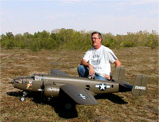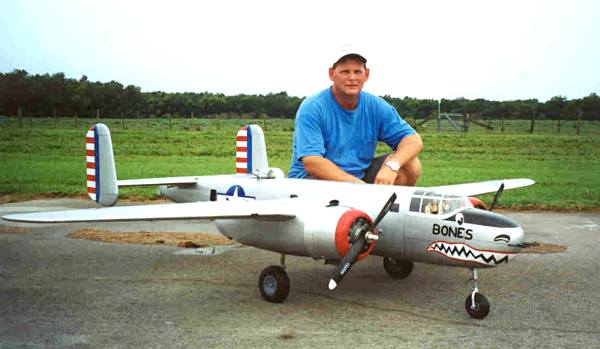 Dean Monticelli displays his B-25 built from Ziroli plans (101"). It is covered with flite metal and uses a pair of RCV 1.20s for power. It weighed 30 lbs before installing receiver and battery. |