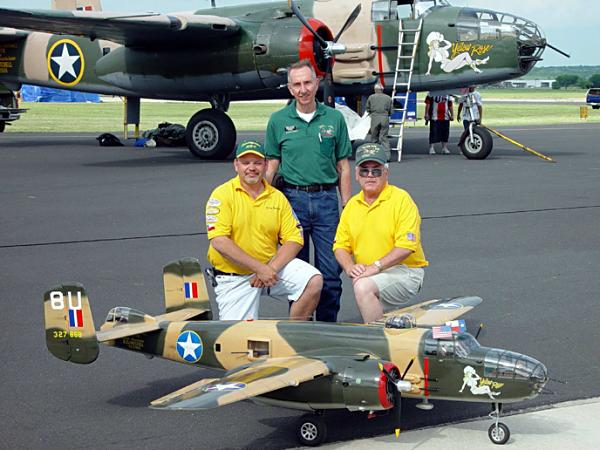 Gary Hughes poses with his Ziroli B-25 "Yellow Rose". Gary's two year project weighs 52lbs and has a 118" wingspan. Two G-28 engines power this bomber and Robart retracts roll it. Gary is far right with full size B-25 pilot Ron Diets in the middle and rc B-25 pilot Larry Holtman on the left. Gary say's his rcwarbird has flown several times at Bomber Field. |
