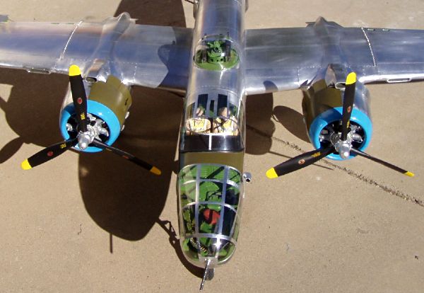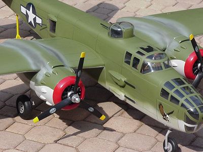 Mike T. Rounds from Schaumburg,Il. with his KMP B-25. 18 lbs. AXI 41130-20 motors, Jeti 77 controlers 2 each side, Thunder 3S2P 4200 mah Lipoly packs, Hitec servos, Futaba radio.