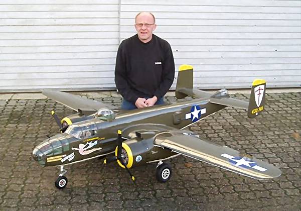 Henrik Hammer from Denmark with his 101 inch span Ziroli B-25-J. Robart retracts, Futaba radio and new OS-120 pumped four stroke engines. It is covered with Oracover in olive and white and the markings are homemade with help from a printer and the stuff that are used on cars and vans for advertising. weight of the finished model will be around 13.0 Kg. (about 26 lbs.) |