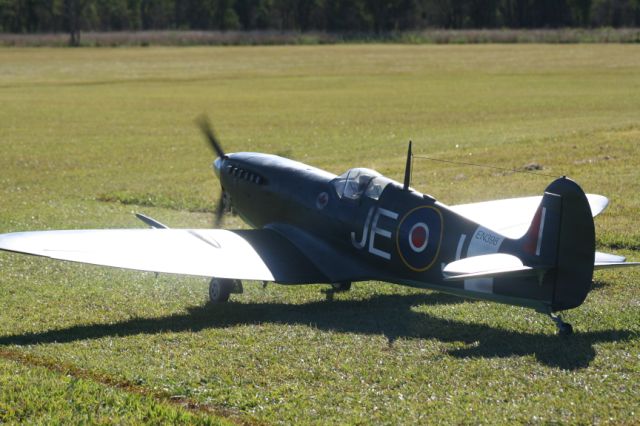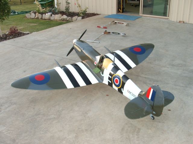 Stephen Thomas' from Queensland Australia sends us pictures of his 98 inch Spitfire from an HD Model design Australia. DA 50R engine swinging a 22/10 two blade Mez. 9 channel JR receiver’. Servos are all Hitec metal geared 645s. 3 x NiCad 2400 batteries. retracts by peter Gower (Australia).¾ ounce glass finish with two Enamel paint finish.