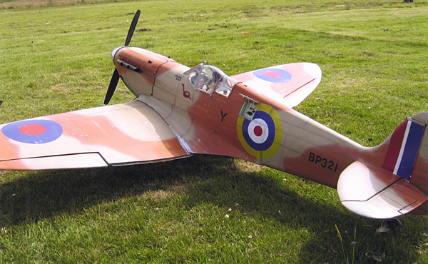 Stuart Godsmak of the UK with his Spitfire built from an original D.B. Sport & Scale Model Kit (foam wings) - 1/5th Scale, weighs 26lb powered by a Zenoah 38cc petrol & 20x8 classic prop. air retracts (custom build) Split flaps work a treat. Colors from Maltese campaign. Flies really scale possibly better with a Z 45cc.