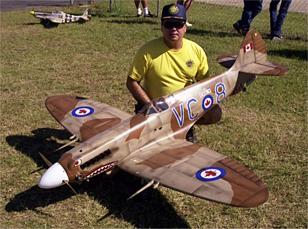 Victor Fortino from Bartlett Ill. has a good hold on his colorful Spitfire. Scratch built from Dave Platt plans by Roger Layton this beauty flies with a B&E 2.7 and Robart retracts. Perfect paint provides the color.