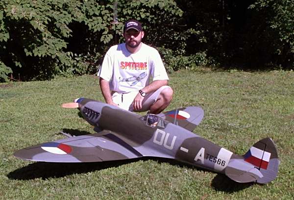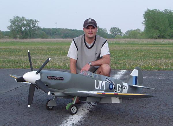 Bill Krummel from Kenner La poses with his American Eagle Spitfire. Bill uses a US41 with a Q 52 carb and header pipe, Robert retracts and Futaba radio. PPG base coat/clear coat finish looks good on this 20lb, 84" wingspan warbird.