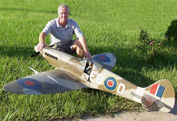 Tommy McClellan with his Mick Reeves ¼ scale Spitfire at 40 lbs. with a 4.2 brison 110 inch wingspan. Tommy say's "Flies great . finish scheme is the north African us air core . bought from the British at the beginning of the war and repainted over the English markings. The roundels stayed on the under side of the wing. Has won many 1ST. place trophies."
