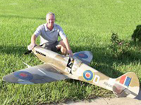 Pete Stevens from Waterbury, Connecticut with his 1/5th scale Spitfire built from a Pica kit. Weight is 27Lbs, wingspan is 88", Futaba electronics and powered by a Sach's 3.1 engine using a 20x10 prop. |