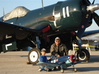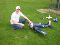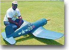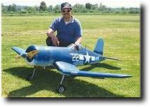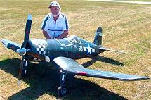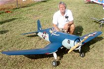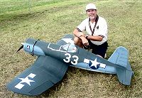Ronnie Colyer from Arlington Texas poses by his Byron Corsair. Ronnie uses a Sachs 4.2 and Robart retracts on his beautiful 86" wingspan warbird. ( Click on picture to see larger image ) |