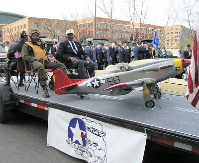 Col. C.I. Williams (retired) and Gary Webb pose with a P-51C and Gary's P-51D. Gary says, "My Tuskegee Mustang has now been retired due to the last two weeks events in Dayton, Ohio. My Mustang was used as a center piece at both the Centennial of flight celebration for the Tuskegee black tie dinner here in Dayton at the Convention center and at the Black cultural festival honoring the Tuskegee Airmen. At the Dinner there was forty Airmen present. I knew this would never happen again and this was the Centennial of flight celebration combined. There are only 27 pilots left. I decided to create a historical record of the event by having all of the Tuskegee airmen and their ground crew members present to sign the aircraft. We photographed each one signing the aircraft. It was then put on display at both the Black Cultural Festival and now on display at the Tuskegee Airmen Tent at the Dayton Air show. This is why building scale is so great. By building this airplane in tribute to the Tuskegee Airmen, I have had an experience of a life time" |