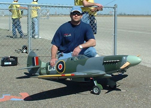 Bill Krummel from Kenner La poses with his American Eagle Spitfire. Bill uses a US41 with a Q 52 carb and header pipe, Robert retracts and Futaba radio. PPG base coat/clear coat finish looks good on this 20lb, 84" wingspan warbird.