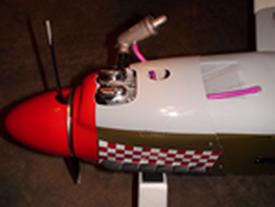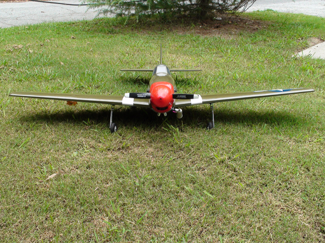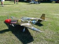 The ground characteristic of the plane were excellent, taxiing true down the runway with only minor rudder inputs. With the flaps in the up position and at full throttle the P-51 took off with authority and in a very short span of runway. Once airborne the cross wind pushed the plane a bit but control was responsive. A few clicks of trim in the ailerons and elevator were needed to get the plane flying true. After a few passes were made PJ had planned to land but the performance of the plane and of the engine were doing so well that a few aerobatic maneuvers were performed. A victory roll and loop were both picture perfect and could easily been mistaken for the real thing. With a few maneuvers out of the way it was time to make a landing pass. Power was cut to just over 1/4 throttle and the flaps were deployed to about 1/2 provide a good sink rate that was slow and predictable. Making another pass, this time setting up for the final with the flaps fully deployed. Despite a near perfect approach landing was a bit bouncy. All in all however a very good first flight.