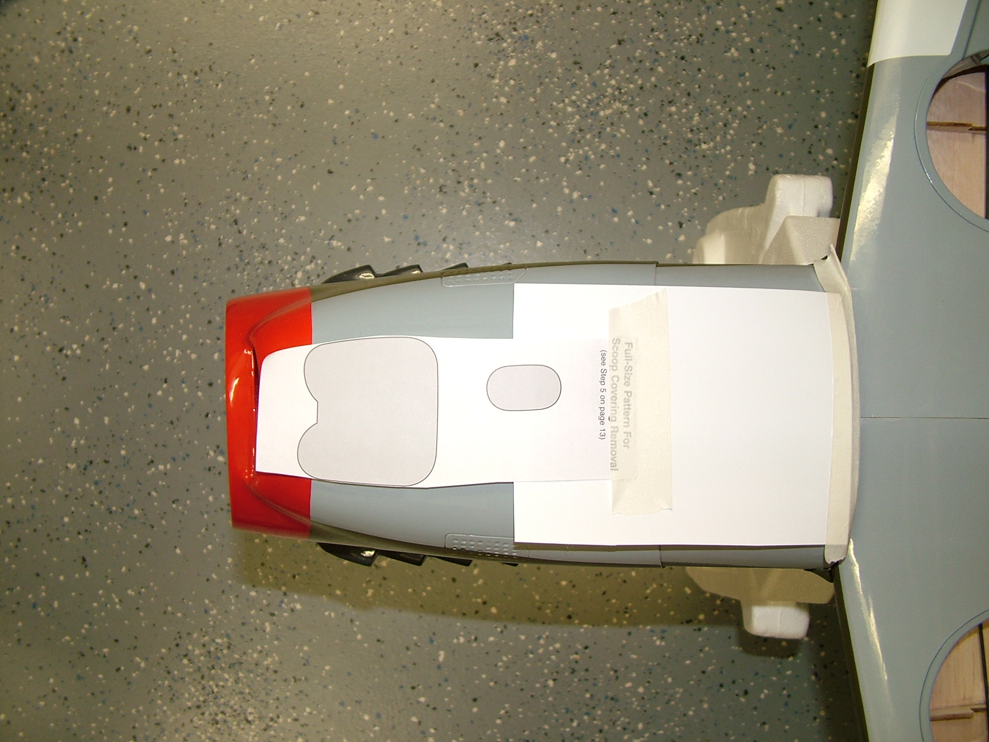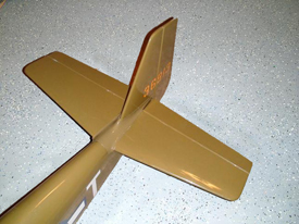 The wing LE fairing is attached in the same way the fillets were but I used CA instead of epoxy. The air scoop also needs to have the covering removed before gluing but this time a template provided in the back of the manual is used for marking where the covering is to be removed. Wing bolt reinforcements had to be glued first to the wing before securing the scoop and the scoop had to have holes cut in it so it could accept the wing bolt guide tubes. With this done it was time to glue the scoop in place, again using CA. Once the scoop was secure the wing bolt guide tubes were slipped in the holes previously cut in the scoop and slide over the wing bolt reinforcements. The tube was then glued to the scoop and reinforcements with thin CA. Lastly the guide tubes were trimmed and the wing was complete. |