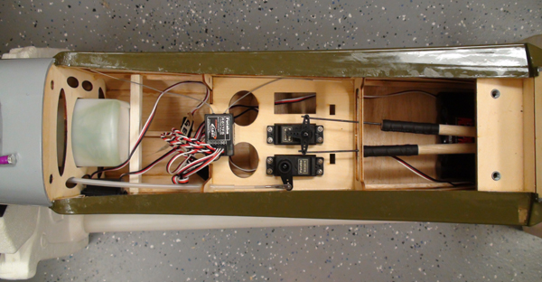 I used Futaba 3003 & 3004 servos with the exception of the elevator and retract servos which were a Hitech and Tower Hobby respectfully. The radio I used is a Futaba 12Z with the FASST 2.4 module and 7 channel FASST receiver. The nice thing about the 2.4 systems besides never having to worry about a frequency pin ever again is the fact that the receivers use very short antenna. No more antenna hanging outside the plane or strung up to the rudder. I used velcro to secure the receiver to the servo tray as it was the most convenient location. The Futaba FASST receivers do not suffer the same way FM/PCM receivers do from vibration, so it is not necessary to wrap it in foam.