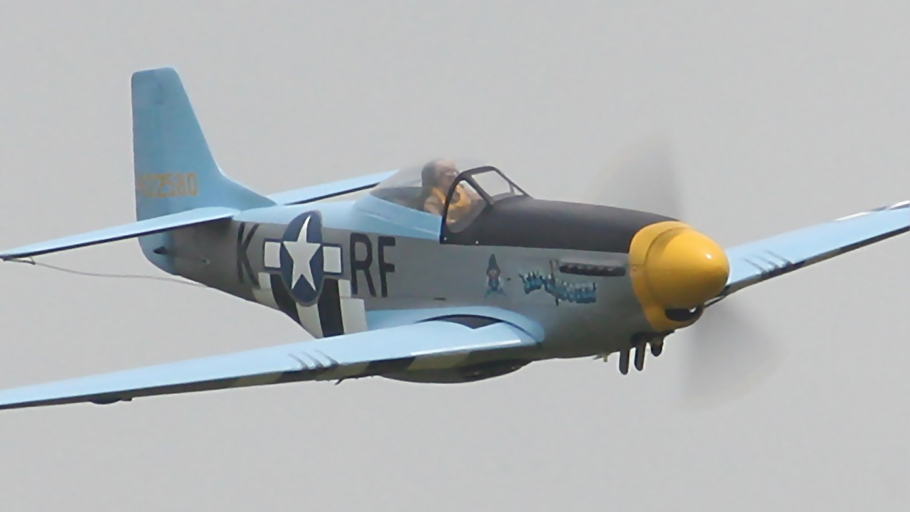 Jet model P-51 with "SIX SHOOTER" color scheme doing a fly-by.