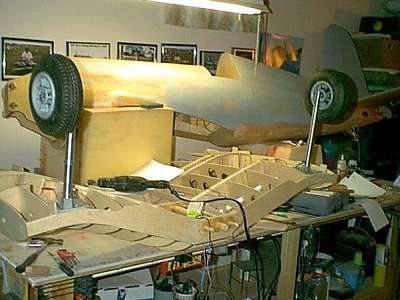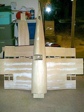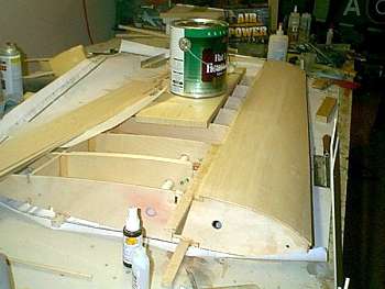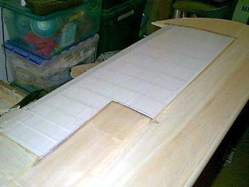 is a shot of the 1/8 balsa leading edge sheeting going on. The can of paint